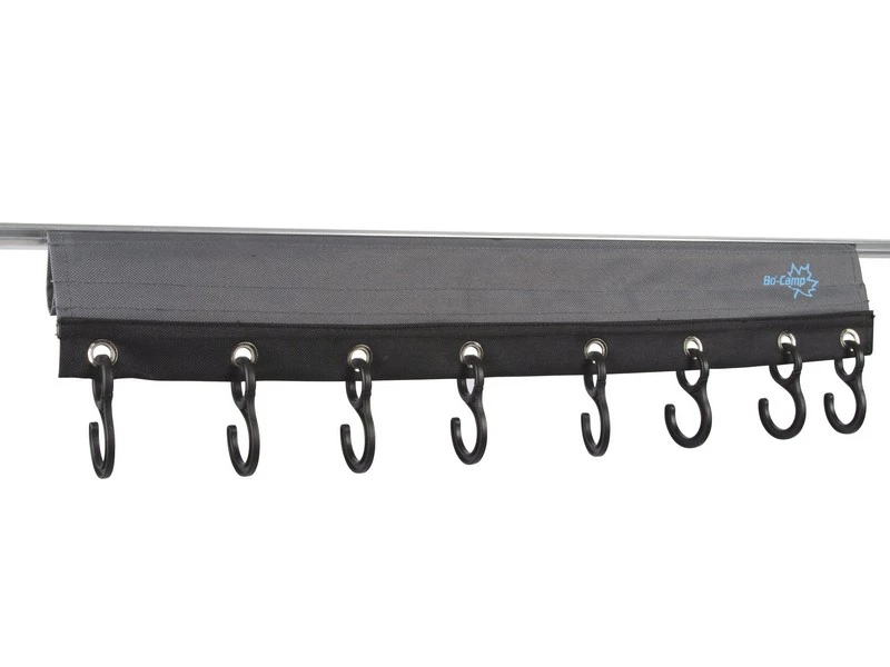 Een universele kapstok met 8 haken. Kan eenvoudig met klittenband worden bevestigd aan de nokstok of met de pees aan een caravanrail. Geschikt voor een tentstok met een maximale diameter van 40 millimeter.