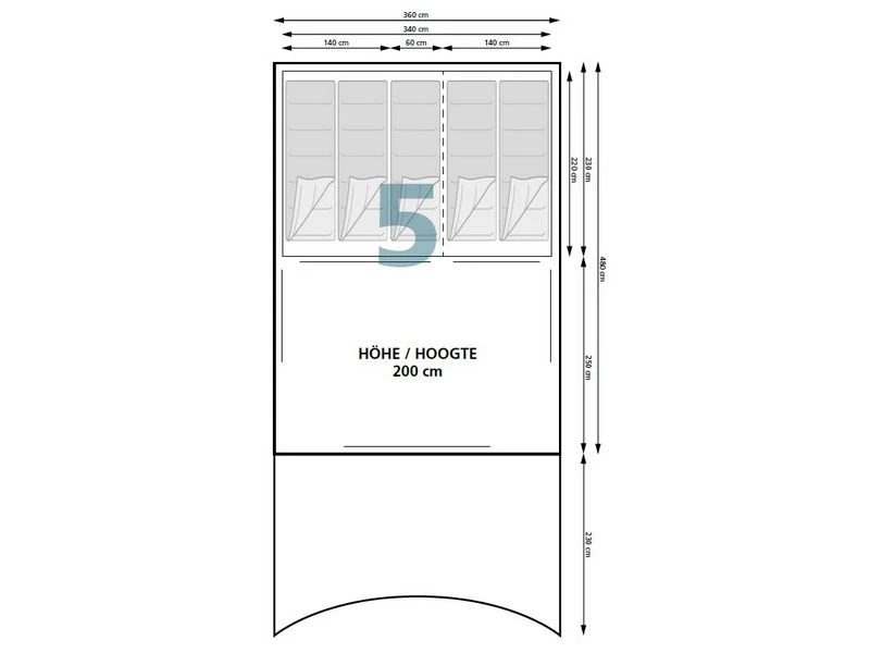 Afmeting 360 x 480 cm (360 x 710 cm incl luifel)